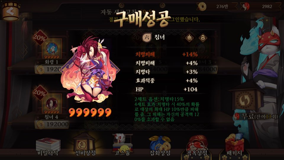 (사실 흑동이 코스튬은 마지막날 샀다. 기본 스킨 흑동자의 그 무심 시크한 눈빛이 너무 좋아서 ㅋㅋ 검은 화염 스킨은 너무 눈이 초롱하지 않나.. 하며 계속 고민함. 그리고 음양사 이 스킨은 향후 2년간 단한번도 풀리지 않아 레전설로 남게된다.......중간에 풀릴뻔 했는데 과금스킨을 그안에 끼워넣는 바람에 이벤트 뒤집어지고 취소됨; 내가 접었을때 풀렸는지 어떤지는 모르겠다)